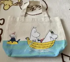 ムーミンキャラクターのイラストが特徴的なアイボリーのトートバッグ。