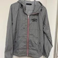 ダークグレーのジップアップジャケット、ポケット付きで機能的。