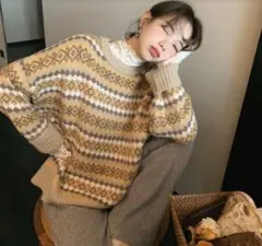 ブラウンとアイボリーのノルディック柄が特徴の長袖ニットセーター。