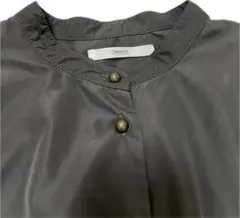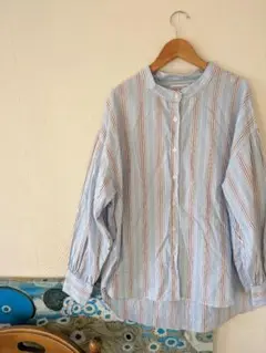 バルーンスリーブデザインのホワイトシャツ、スタンドカラーでシンプルなボタン付き。