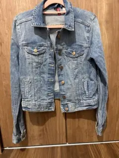 ライトブルーのデニムジャケット、フロントボタン留めでカジュアルなスタイルに最適。