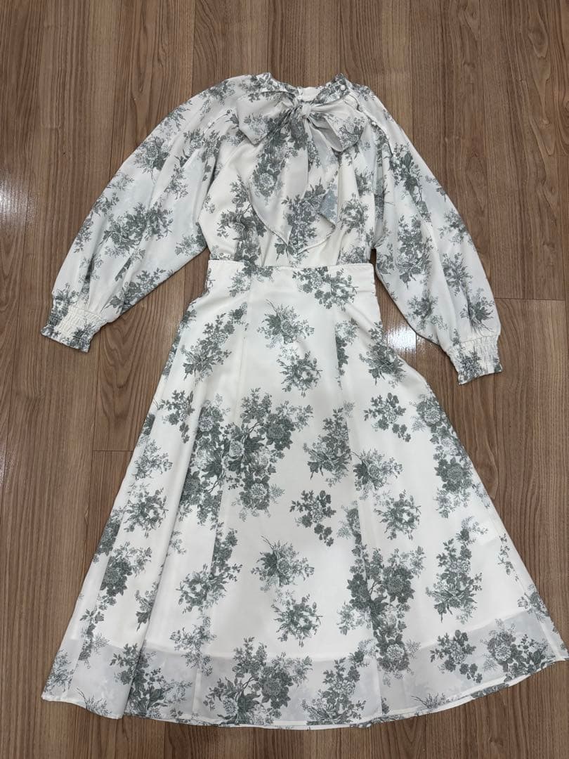 ホワイトとグレーの花柄のシフォン製セットアップ、リボン付きブラウスとロングスカートのデザイン。