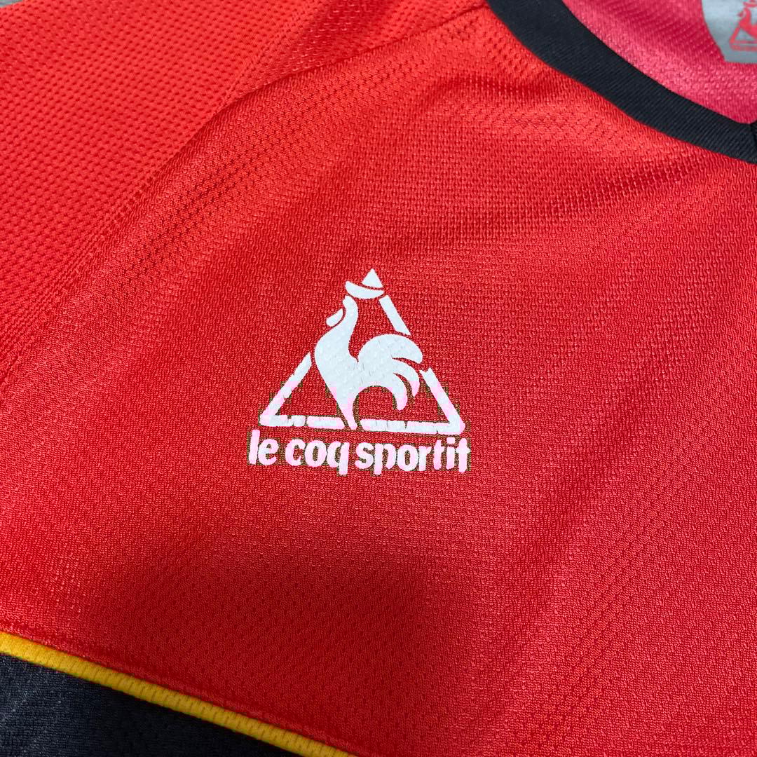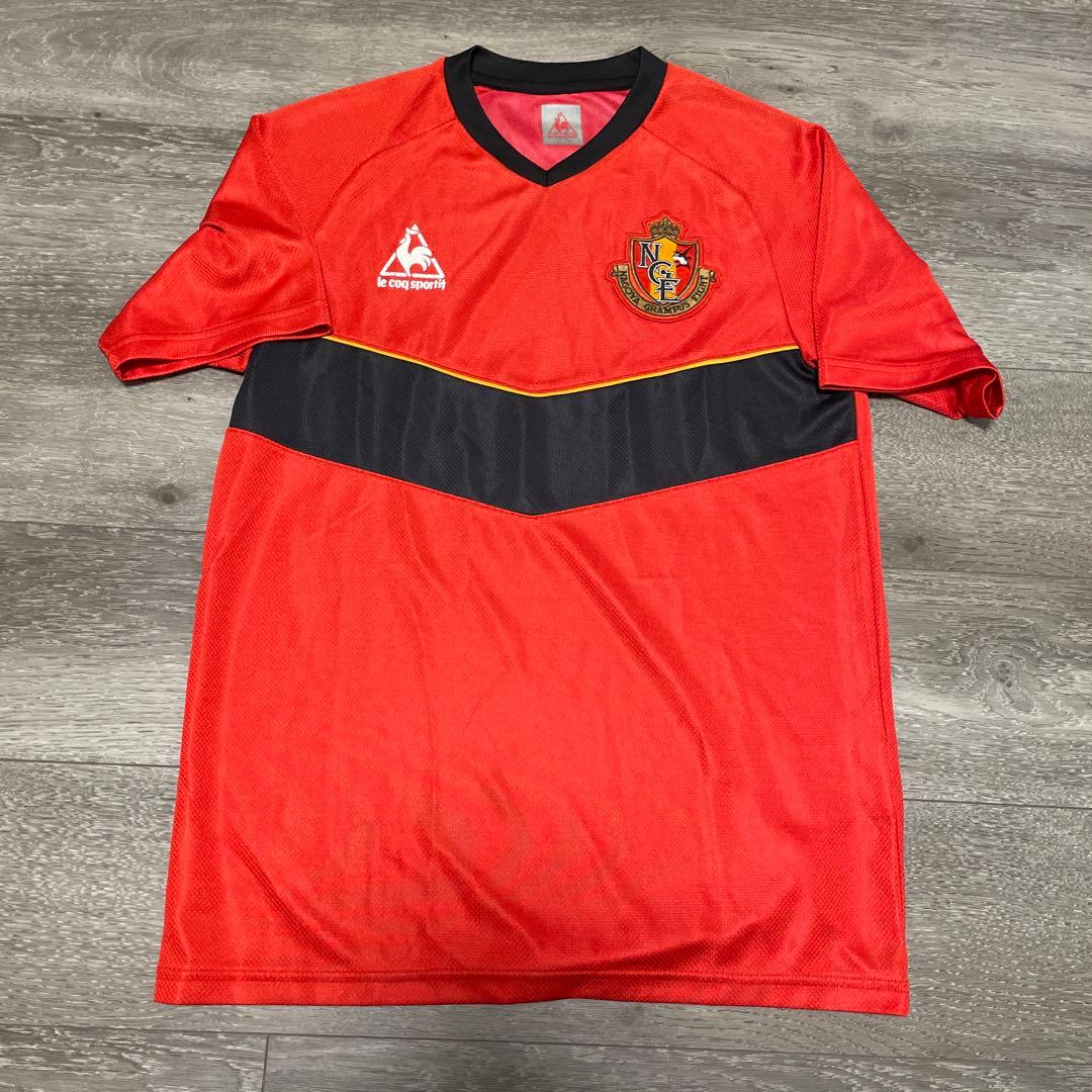 レッドカラーのボディで胸はイエローを挟んでブラック、襟周りはブラックに切替されており、右胸には鶏をあしらった le coq sportifブランドロゴ がプリントされ、左胸には NGE NAGOYA GRAMPUS EIGHT エンブレム が刺繍されています。