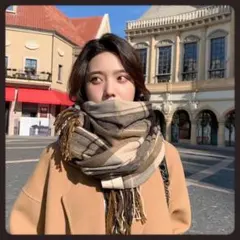 ⚫️チェック柄フリンジ付きマフラー オレンジ 青 黄色 おしゃれ 膝掛け 防寒