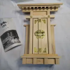 木製の神棚、金色の装飾付き、二つの扉が開くデザイン。