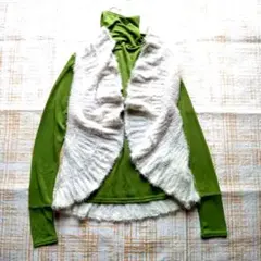 柔らかいニット素材のピンクカーディガン、ファー襟付きでフレア袖デザイン。