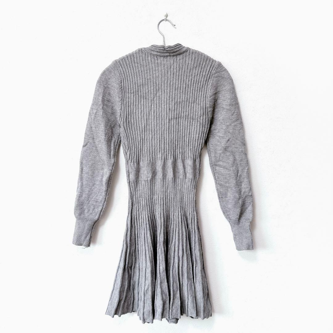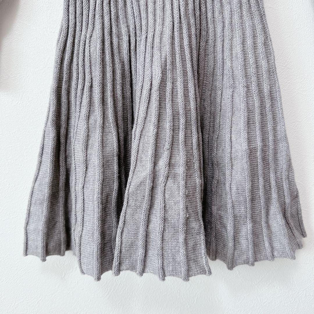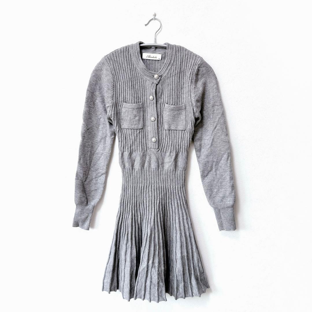 リブ編みデザインのグレーの長袖ニットワンピース、フレアスカートスタイル。