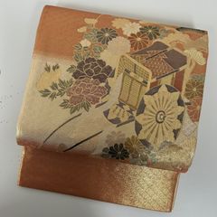 シルバー地に紗綾形が織り込まれ、白をベースに扇のオレンジとピンクも上品な色合いです。