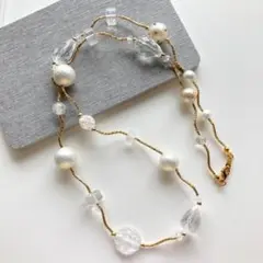 蝶とパールのロングネックレス ゴールド パール調 ガラス
