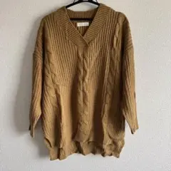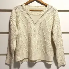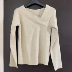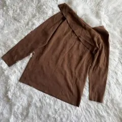 オフショルダーとリブ編みのデザインが特徴のダークパープルのニットセーター。