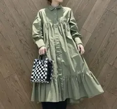 長袖シャツワンピース、Vネックとギャザーが特徴。