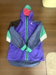 adidasのナイロンジャケットです。鮮やかなブルーとホワイトの切り替えデザインに、大きなトレフォイルロゴが特徴的です。フード付きで、スポーツシーンだけでなく普段使いにも活躍します。