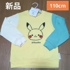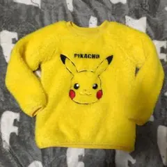 ピカチュウのイラストが特徴のクリーム色トレーナー、Vネックデザインでストライプの内側。