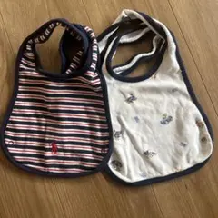 ピンクと紫のストライプデザインのスタイ3点セット、フリル付きで可愛い。