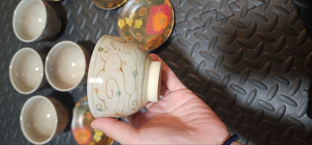 花柄の装飾が施された陶器製の茶碗と皿のセット。