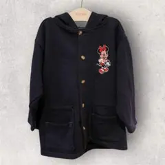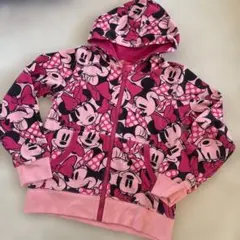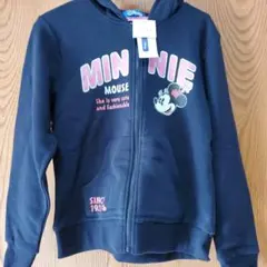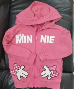 ミニーマウスのプリントが特徴のグレーのフード付きパーカー、サイズ140。