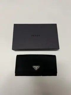 ネイビーのPRADAレザー長財布、カードポケット多数、ファスナー付き小銭入れあり。