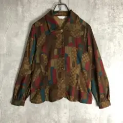 レトロ ヴィンテージ 総柄 ブラウス シャツ くるみボタン ブラウン