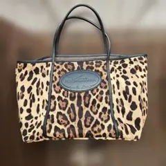 ヒョウ柄の合成皮革トートバッグ、黒のハンドル付きで大きめのサイズ。