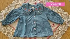 ミニーマウス刺繍のデニムクロップドジャケット、フリル付き襟とハート型ボタンが特徴。
