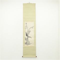 本品は「雪山」銘のある水墨山水掛軸です。静寂な渓谷に高士が佇む、南画風の大変趣のある一幅で、松樹や岩肌、滝の表現にも味わいが感じられます。