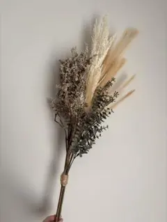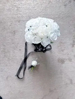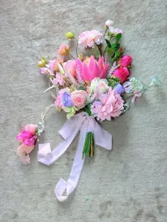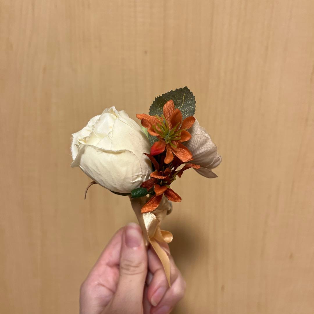 オレンジとベージュの造花ブーケ、クリーム色のリボン付き