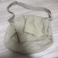 淡い黄色の合成皮革製ドローストリングショルダーバッグ。
