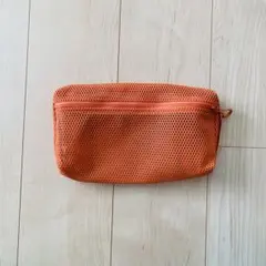 ネイビーのメッシュ素材で作られた小型ポーチ、ダブルジッパーと金属リング付き。