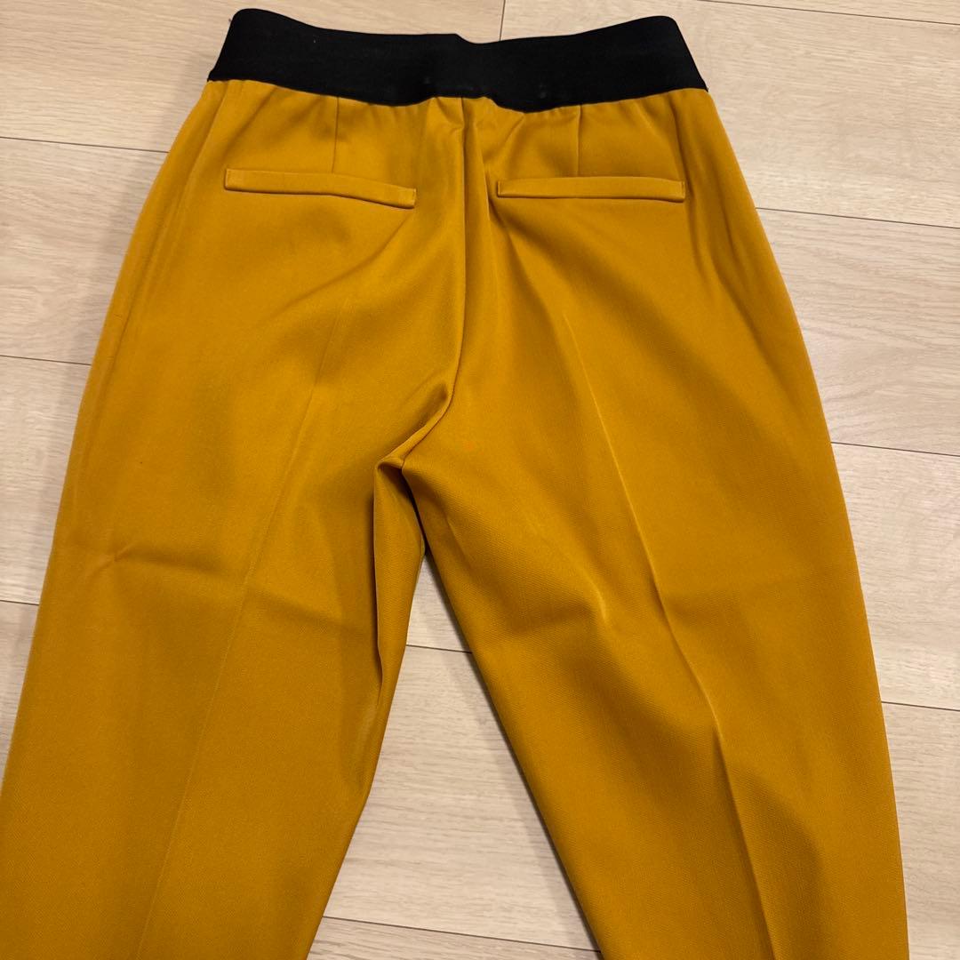 マスタードカラーのスラックス、ブラックゴムウエストデザイン、バックポケット付き。