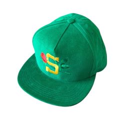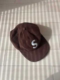 コーデュロイ素材の深緑ベースボールキャップ、フロントにSの刺繍、SUPREMEブランド。