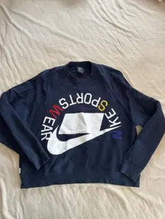 胸元のカラフルなロゴが特徴のネイビーとホワイトの長袖トレーナー。
