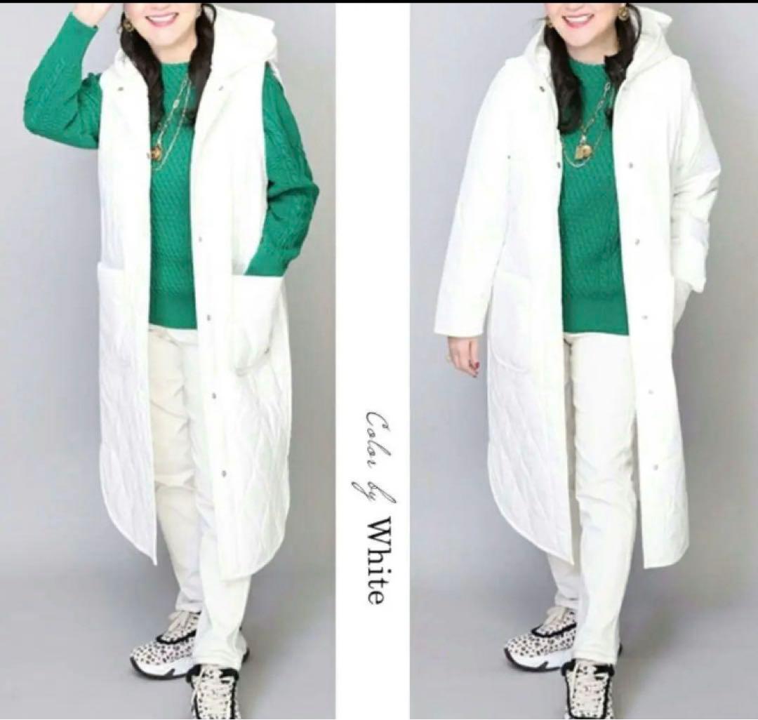 フードと袖が取り外し可能で4通りの着方が楽しめるキルティングロングコートです
