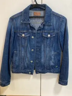 ダークブルーのデニムジャケット、スタンドカラーとボタン付きのシンプルなデザイン。
