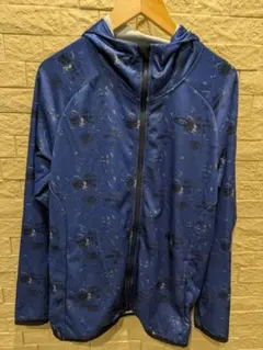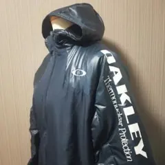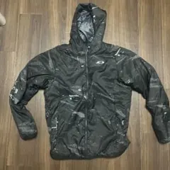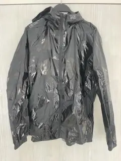 フード付きのブラックナイロンジャケット、キルティングデザインで機能的。
