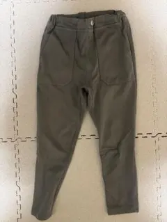 スウェット素材のグレーの長ズボン、リブ付き裾、ポケット付きでカジュアルなデザイン。