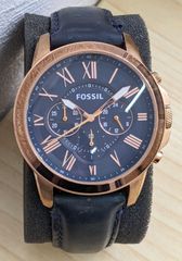 青い文字盤とステンレススチールのシンプルなデザインのFOSSIL腕時計。