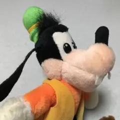 ディズニーのグーフィーぬいぐるみ、約30cmのサイズで、オレンジと青のカラフルなデザイン。
