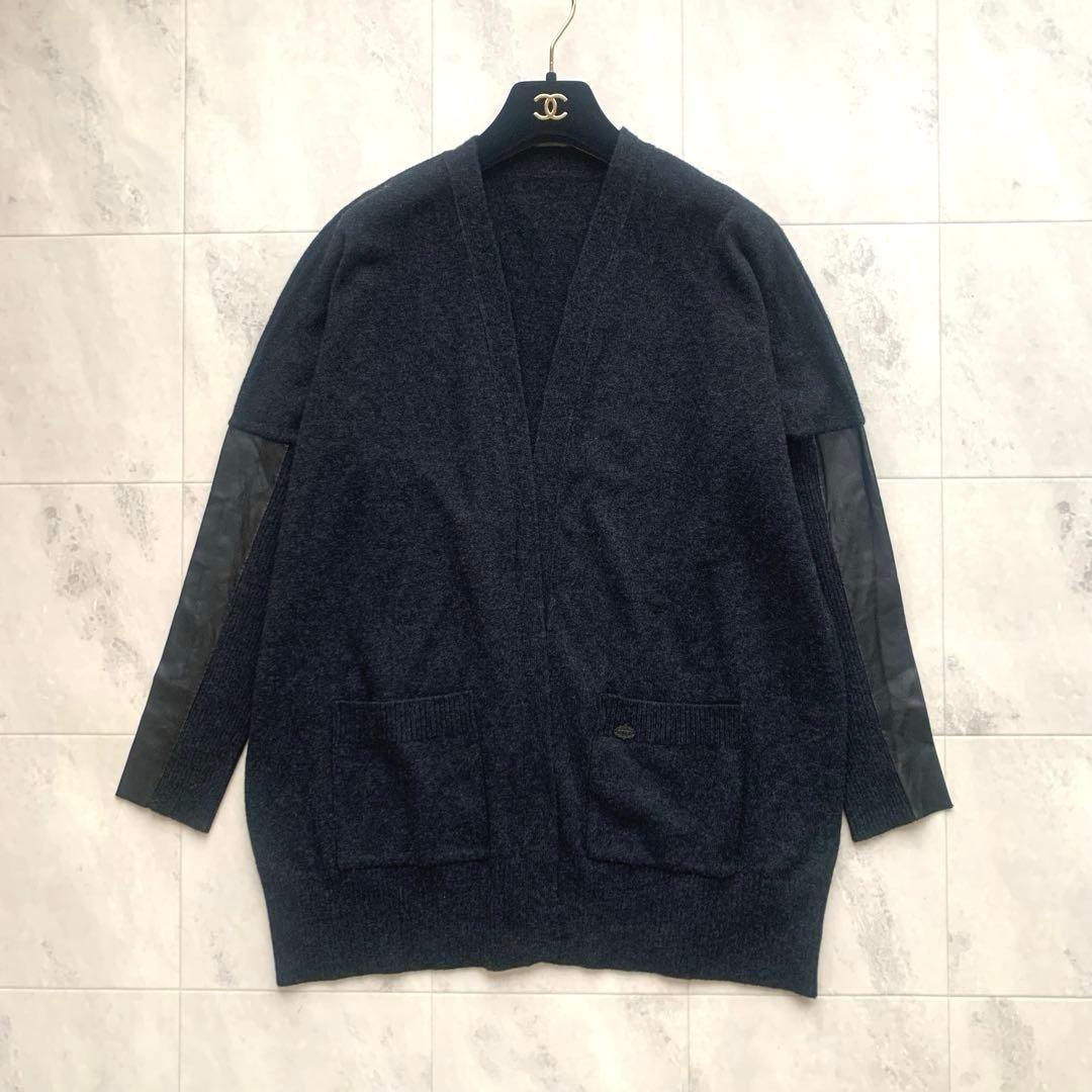 フォクシー カシミヤ100% レザー切り替え カーディガン ブラック