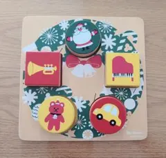 温かみのある木製パズルで、サンタクロースやラッパの絵の型はめ遊びや、積み木のように重ねて遊ぶこともできます。