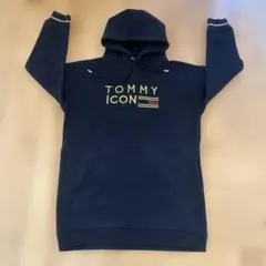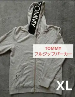 フロントジッパーの黒いパーカー、TOMMYの大きなロゴが特徴。