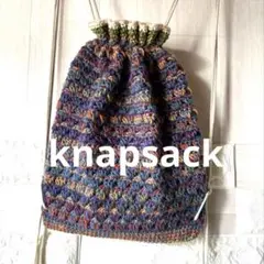 アクリル素材の毛糸でかぎ針編みをしたハンドメイドのニットナップサック(リュック)です。