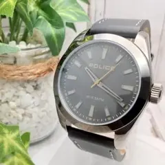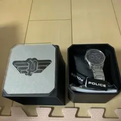 シルバーのステンレススチール製のPOLICEアナログ腕時計。日付と曜日表示機能付き。