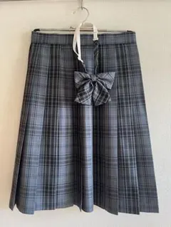 明るめ紺色のチェック柄のプリーツスカート、リボンとネクタイ付き。