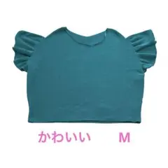 アーヴェヴェ フリル袖 ショート丈夏ニットトップス ブルー カジュアル