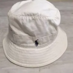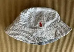 フリル付きのピンクとネイビーのストライプデザインのニットハット。