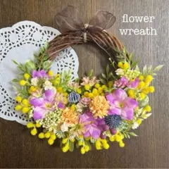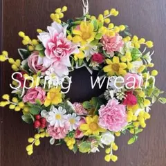 春を告げるミモザのやわらかな黄色に、ピンクや白の花々を重ねた優しい雰囲気のナチュラルリースです。