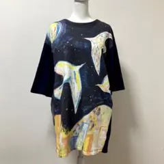 タイトルは「ドーナツ」。ジョージが左胸のポケットを引っくり返して中からたくさんのドーナツをばら撒いている様子をモチーフに。ホワイトの地に、イエローのボーダー。ネイビーのポケット、黄色や黒や茶色でジョージとドーナツの刺繍。こぼれ落ちたドーナツが、裾の方に刺繍加工で配置されているのがユニーク。