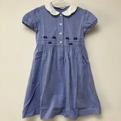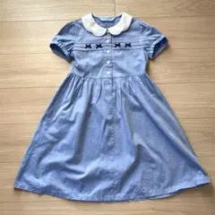 デニム風のブルーワンピース、リボンとボタン付きで可愛らしいデザイン。