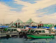 港の風景 水彩画 木製フレーム付き F6号サイズ