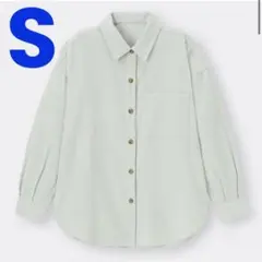 オリーブ色のコーデュロイ長袖シャツ、胸ポケット付き。